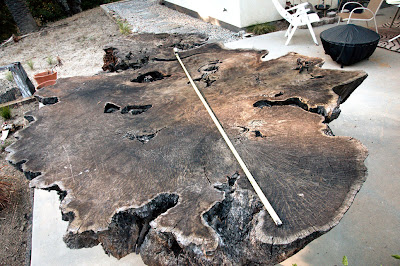 By contrast, I've recently been given the opportunity to undertake a very special legacy project. A client recently contacted me with a very interesting challenge. She said she had a large redwood slab that she wanted turned into furniture. Turns out, "large" was an understatement! For reference, the tape measure in the picture below, is extended 8 feet.